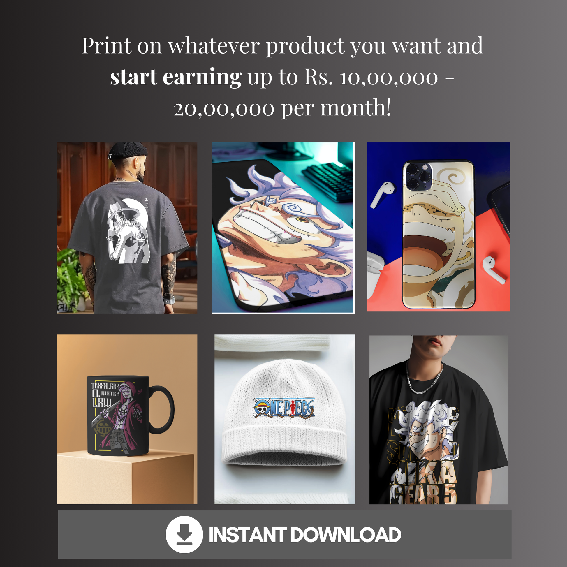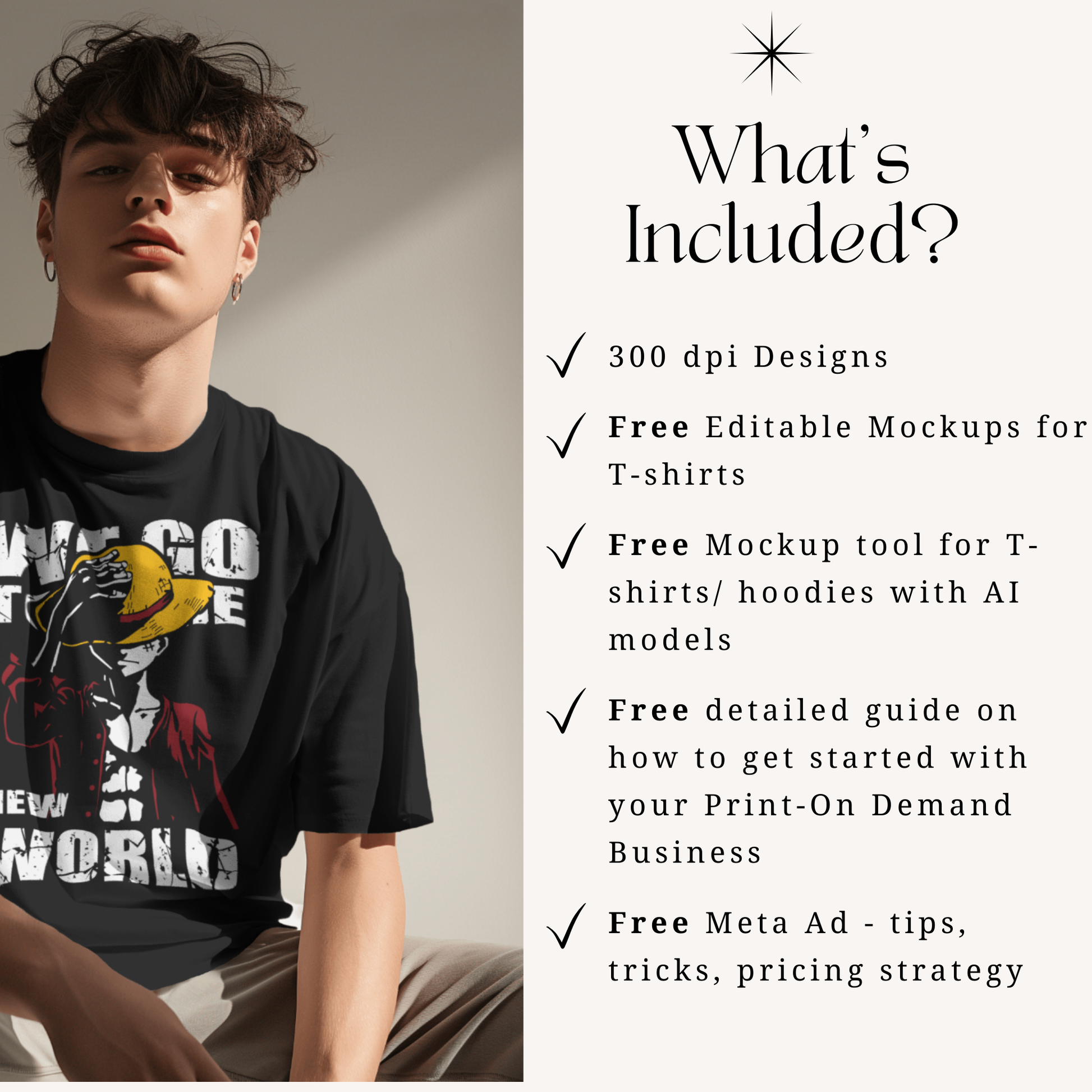 Set sail on your print-on-demand journey with our One Piece Anime Design Bundle! Inspired by the GOATED series, this bundle features high-quality, fan-favorite designs including Luffy gear 5 - perfect for One Piece enthusiasts. Whether you're launching your store or expanding your product range, this bundle includes everything you need to succeed—from editable mockups to marketing tips.